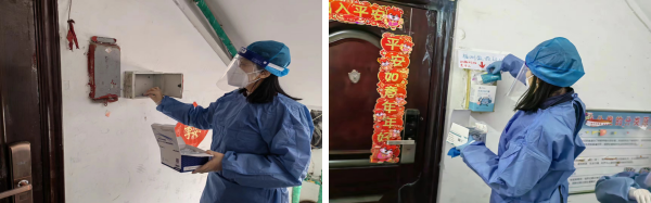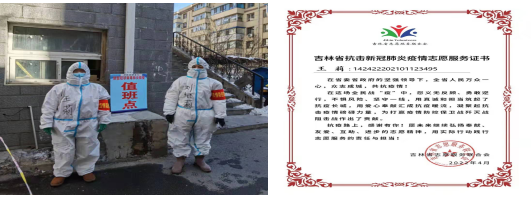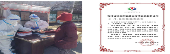 随着疫情的发展,她所在华大天朗小区发现阳性病例,成为封控小区,她自愿下沉到所在小区协助核酸检测等工作。在志愿服务期间主要负责核酸检测掰管工作,同维持秩序任务相比,掰管具有更大的风险性。长春的春天气温并不高,每次手上喷涂的酒精、消毒液的快速挥发都使手处于更低的温度而变得僵硬,但最后她都完美地完成了任务。