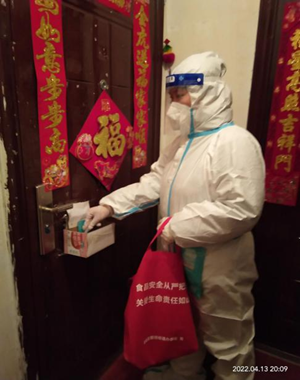 “家里几口人?”在二道区八里堡街道昊泽富苑小区,财务管理办公室的孙鹤同志正在为居民登记信息。作为下沉人员,她要协助社区进行核酸检测登记、核酸检测试剂整装、物资搬运和调配等工作,经常天刚亮就出门,将近深夜才回家,有时候加班加点到很晚才休息。有时任务紧急,赶往岗位时来不及安顿家中的孩子;有时为了节省时间不去厕所,一整天都不喝水。为做好一线防控,不知疲倦。